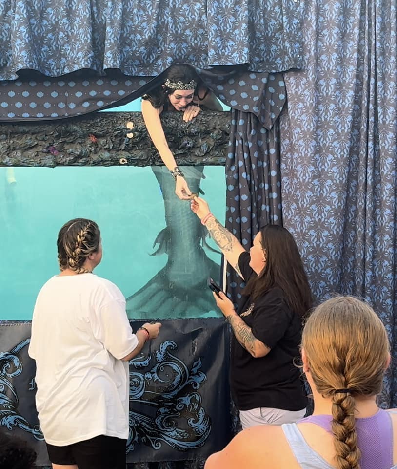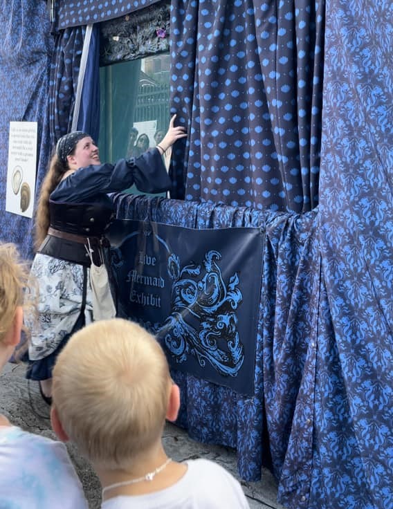 Our Live Mermaid Exhibit starts with our high seas explorer telling stories of their travels and study of the various species of mermaids.